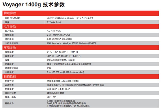 Voyager 1400g二維影像條碼掃描器二維條形碼由于各種原因而越來越流行于眾多行業(yè)應(yīng)用中。一些企業(yè)是因?yàn)橄M軌蛟谟邢薜目臻g內(nèi)存儲(chǔ)盡量多的數(shù)據(jù)信息,一些企業(yè)則是為響應(yīng)政府行業(yè)規(guī)章或供應(yīng)商的要求。更多的企業(yè)甚至只是希望在現(xiàn)在或未來能夠利用由二維影像技術(shù)引領(lǐng)的新興趨勢(shì),而無需再去另外購(gòu)買掃描器硬件。Voyager 1400g二維影像條碼掃描器能夠支持PDF和二維條碼掃描而無需額外的增值功能配置,如先進(jìn)的圖像采集和處理應(yīng)用,從而使霍尼韋爾二維掃描方案的價(jià)格更富有競(jìng)爭(zhēng)力。