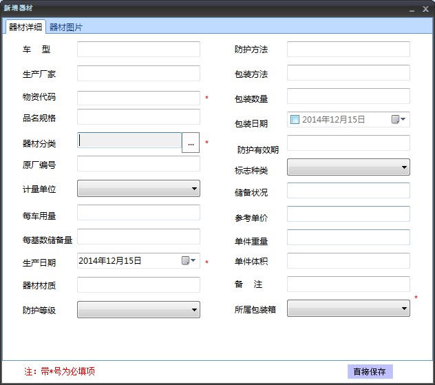 l 填寫(xiě)完成后,點(diǎn)擊“直接保存”按鈕保存器材信息。