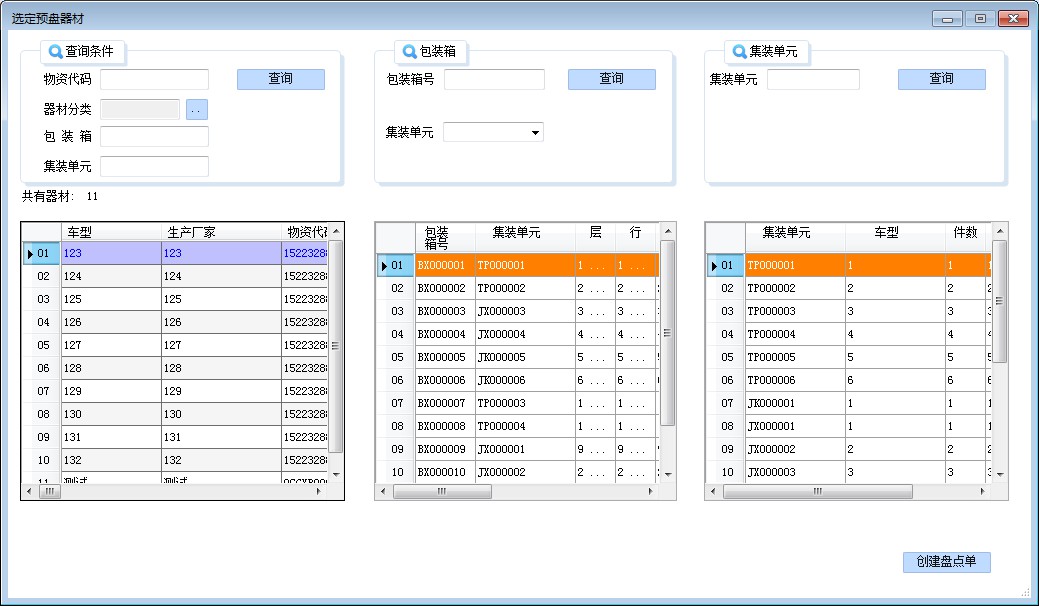 器材盤(pán)點(diǎn)、包裝箱盤(pán)點(diǎn)、集裝單元盤(pán)點(diǎn),三個(gè)盤(pán)點(diǎn)任選其一進(jìn)行介紹: