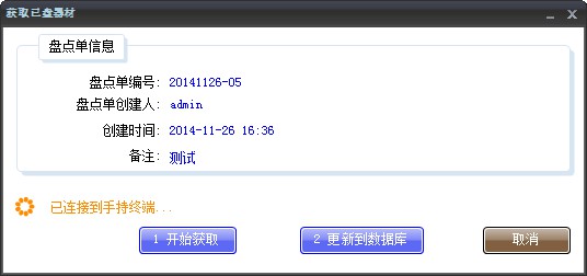l 點(diǎn)擊“開(kāi)始獲取”按鈕,系統(tǒng)會(huì)提示關(guān)機(jī)手持上盤(pán)點(diǎn)系統(tǒng)字樣,然后點(diǎn)確定會(huì)自動(dòng)到手持的特定目錄下將數(shù)據(jù)文件上傳到PC機(jī)上。獲取成功后,界面上會(huì)顯示該盤(pán)點(diǎn)單的信息,包括單號(hào)、盤(pán)點(diǎn)單創(chuàng)建人等。